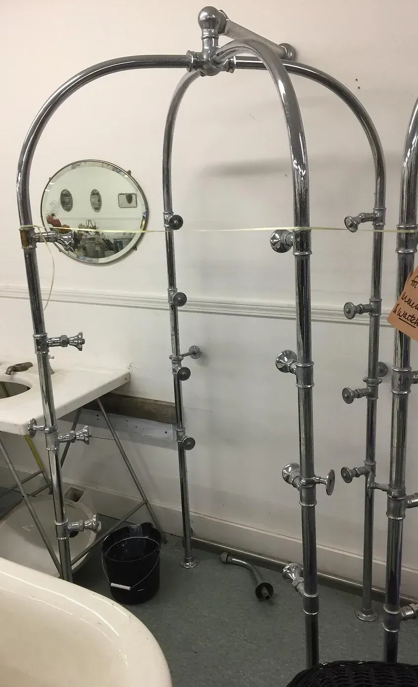 Here is an example of one of the better Needle Bath showers available at the time. This example is free standing, with oversized shower head, needle bath ribs, kidney sprays, thermometer and bidet. Truly a fine gem valued at more than the medium sized home at the time. We do sell and buy these so contact us if you're interested in buying or selling.